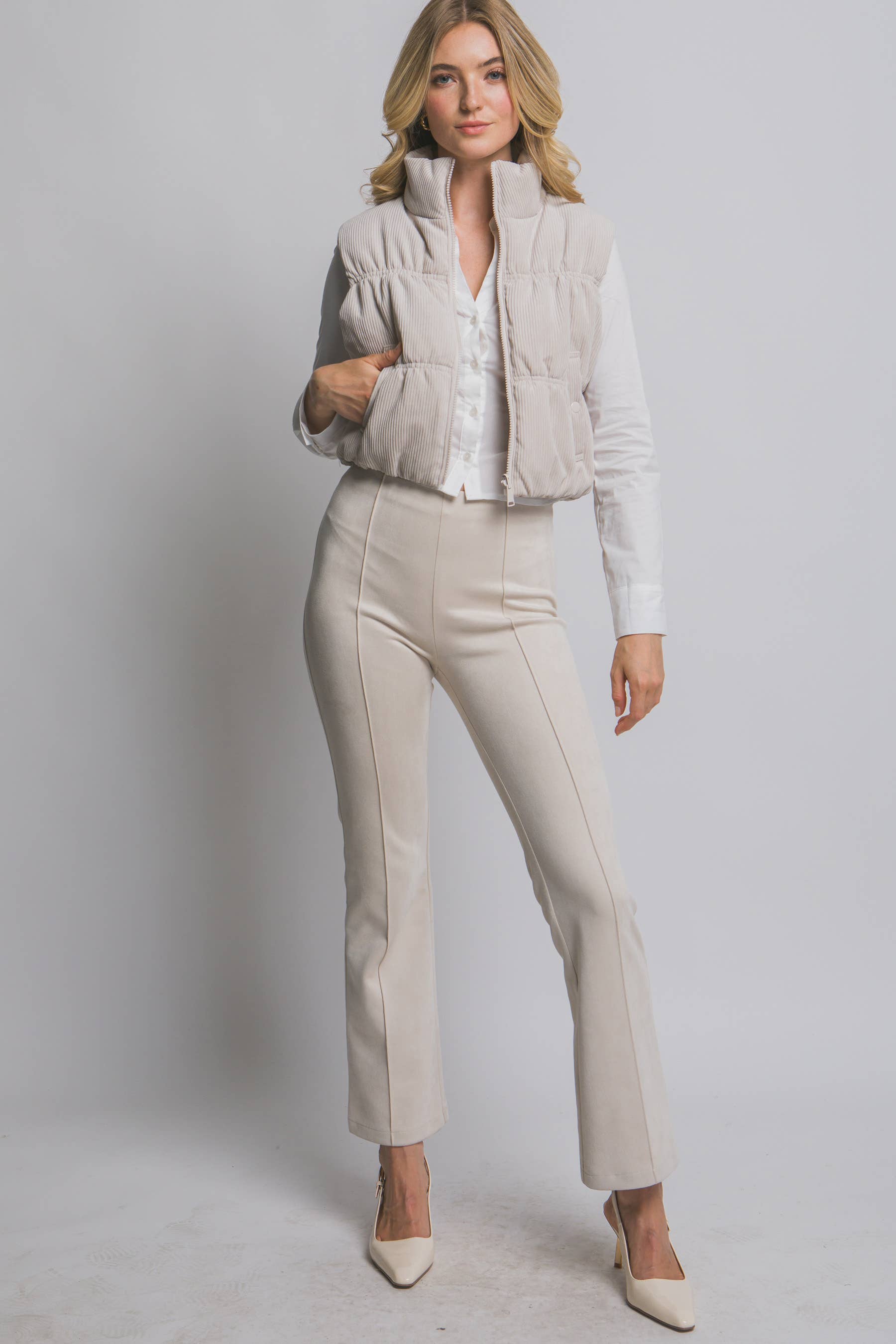 Layer up with versatile style in this reversible puffer vest. One side features a striking Aztec print for bold visual interest, while the other showcases classic corduroy texture. The lightweight puffer construction provides warmth without bulk, making it perfect for transitional weather or layering over your favorite tops. Flip it to match your mood and outfit—two looks in one piece. Whether you're heading out for casual adventures or cozy days at home, this vest adapts to your style effortlessly.