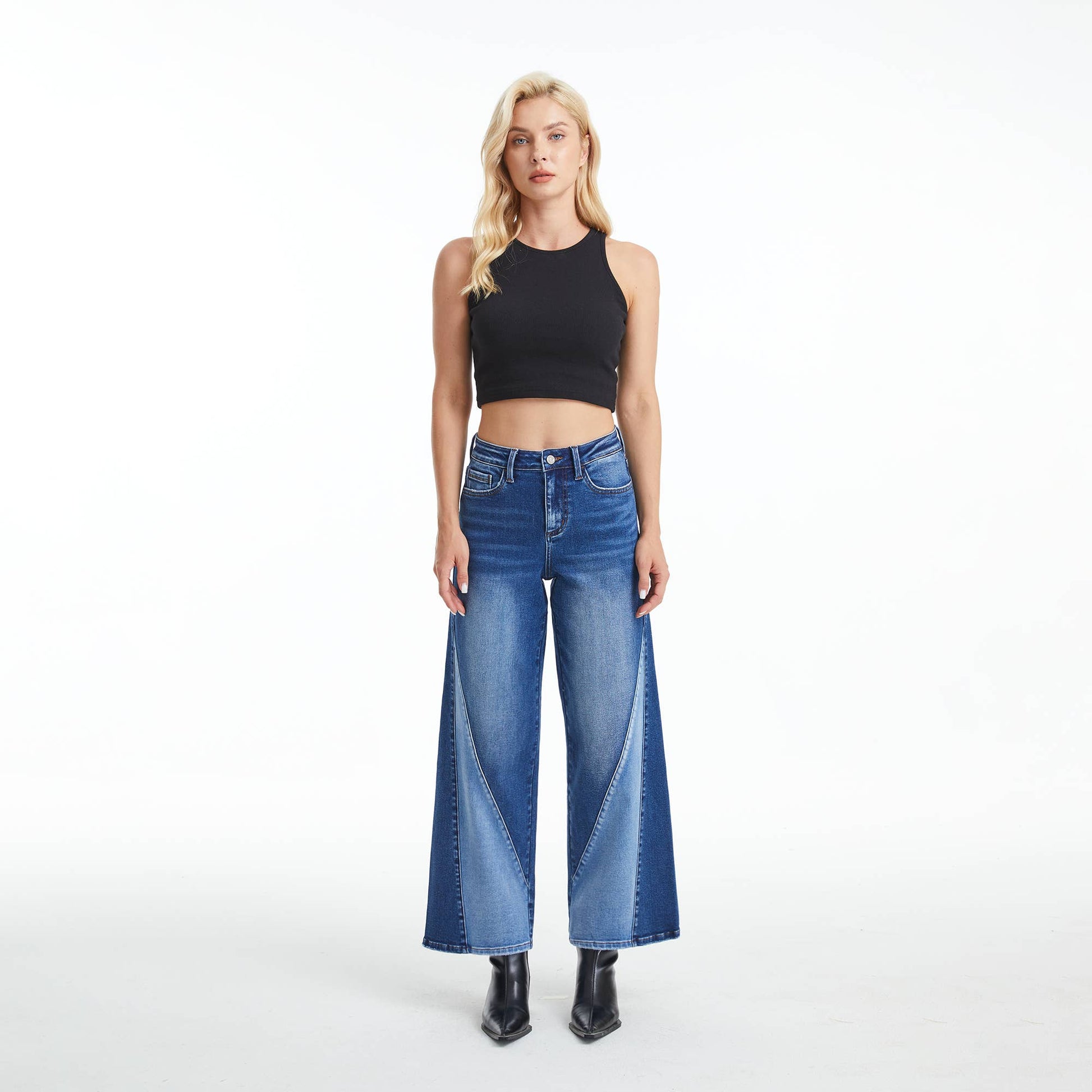 Elevate your denim collection with these high-rise jeans that combine style and wearability. The super stretch fabric ensures all-day comfort, while the striking two-tone palette of dark and light blue creates a modern look. Thoughtful details—including patchwork accents, whisker effects, and natural washing—give these jeans character and depth. The high-rise cut flatters your silhouette, and practical features like five pockets, a zipper fly, and ground pocket openings make them as functional as they are fashionable. A polished finished hem rounds out this go-to piece.
