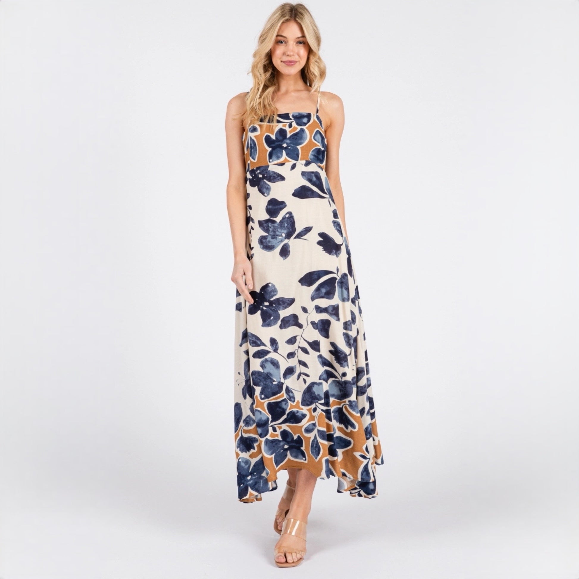 Crafted for effortless elegance, the Floral Border Print Sleeveless Maxi Dress features a flowing silhouette that flatters a variety of body types. Its sleeveless design ensures breathability, while the distinctive floral border print adds refined detail without overwhelming the look.