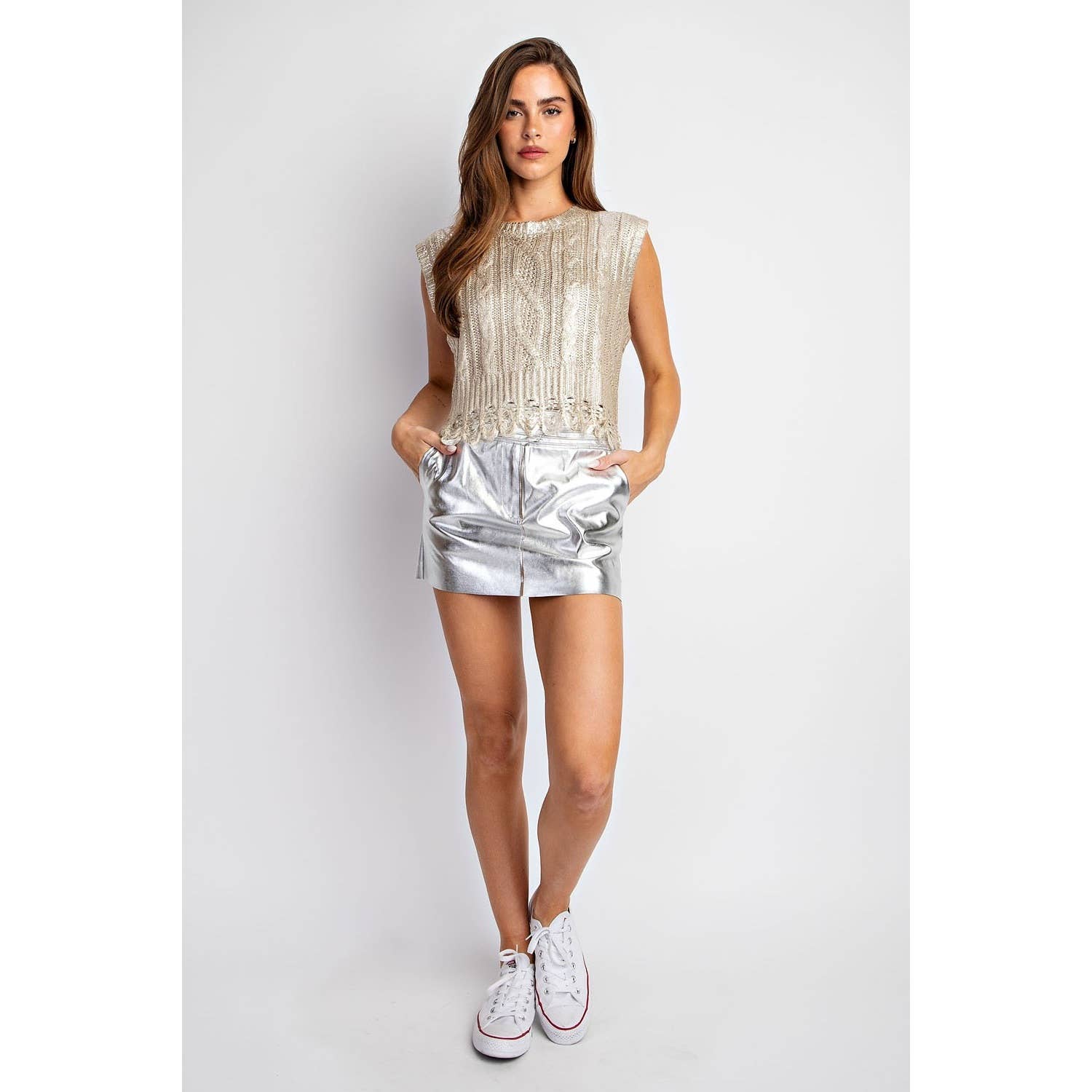 Elevate your layering game with this stunning Fringe Hem Metallic Cable Knit Vest. The intricate cable knit pattern adds timeless texture, while shimmering metallic threads catch the light beautifully. Finished with a playful fringe hem that brings movement and personality to every outfit, this versatile piece transitions seamlessly from casual to dressed-up occasions. Perfect for layering over your favorite tees or sweaters, it's a wardrobe essential that celebrates your unique style.